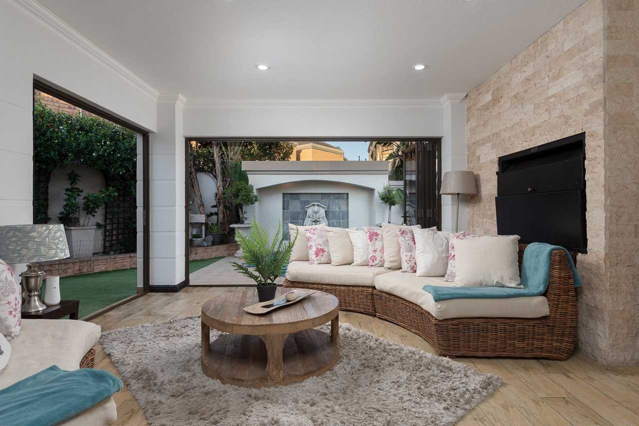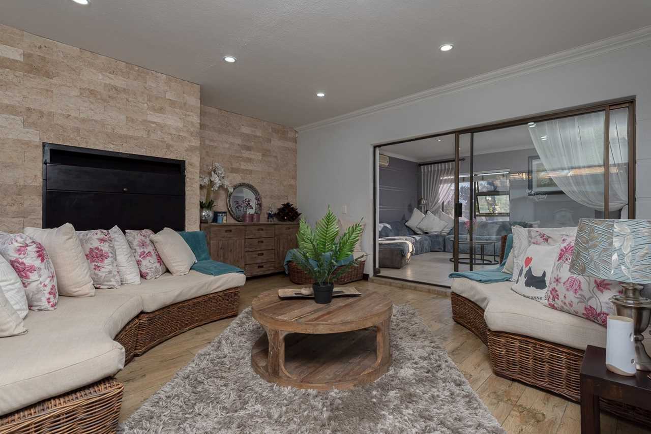 Double-volume entrance hall, elegant dining room with aircon, Large TV lounge with wallpaper feature, and an amazing enclosed sunroom/entertainment patio with built-in braai and stack doors opening to the pool.