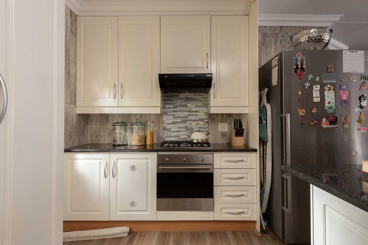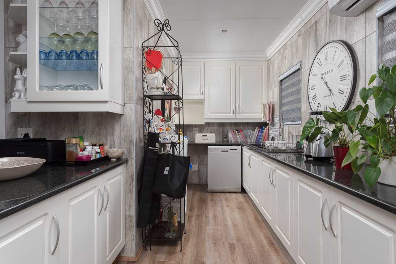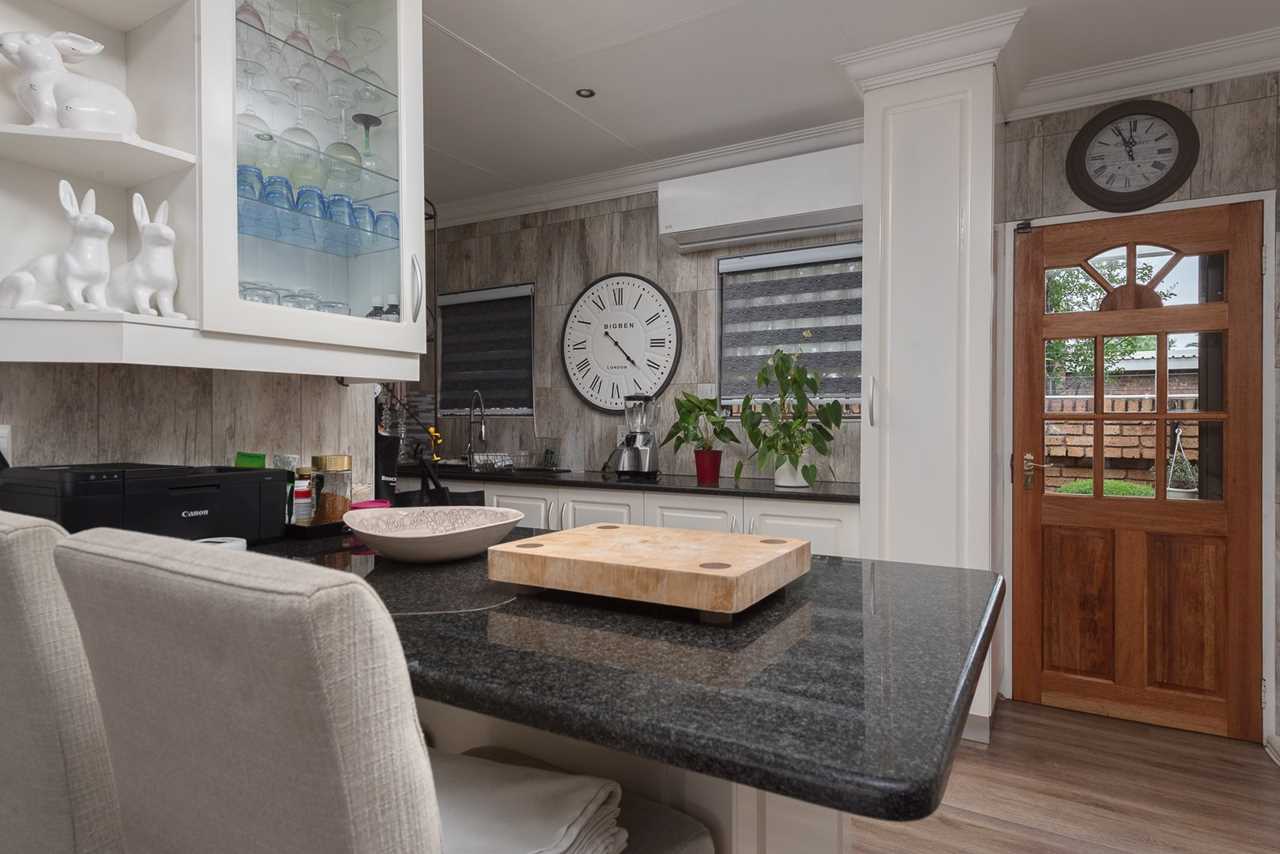 - Modern kitchen with white cupboards and black granite tops, breakfast nook, 4 plate smeg gas hob, smeg electric oven, space for 2 washing appliances, large aircon unit,